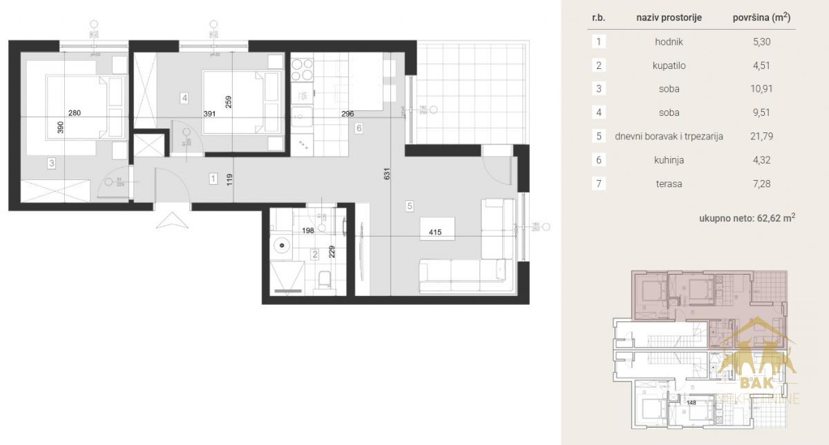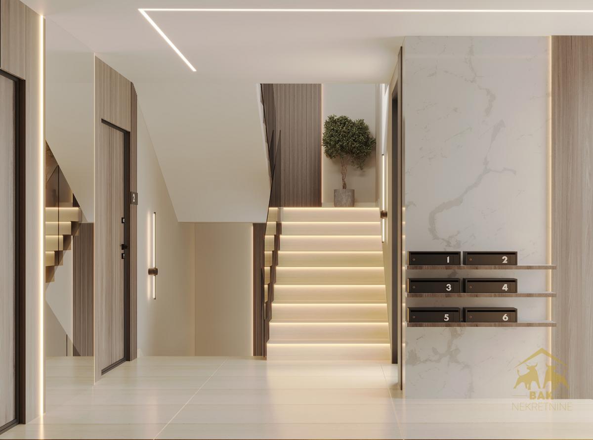 U prestižnom i mirnom delu Sremske Kamenice na Tatarskom brdu, u okruženju koje spaja privatnost, zelenilo i vrhunsku novogradnju, nudi se ekskluzivan trosobni stan u izgradnji površine 63 m² sa dodatnom krovnom terasom od 60 m², idealnom za uživanje na otvorenom i stvaranje posebnog ambijenta za odmor, druženje i uživanje. Ovaj stan spaja moderan dizajn, funkcionalnost i vrhunski komfor, a pametno osmišljen raspored maksimalno koristi svaki deo prostora i obezbeđuje obilje prirodne svetlosti, stvarajući topao i prijatan ambijent za svakodnevni život. Prostran i lepo orijentisan dnevni boravak povezan je sa trpezarijom i kuhinjom, uz diskretno odvajanje koje omogućava privatnost i praktičnost, dok dve veće spavaće sobe pružaju mir i udobnost. Stan poseduje moderno kupatilo, funkcionalno organizovan hodnik, prelepu terasu na koju se izlazi iz dnevnog boravka, kao i podno grejanje koje doprinosi osećaju topline tokom cele godine. Raspored je pažljivo osmišljen i prilagođen potrebama porodičnog života, čineći stan idealnim za svakodnevno stanovanje. Zgrada se izdvaja savremenim arhitektonskim izrazom sa čistim linijama i velikim staklenim površinama koje unose obilje prirodne svetlosti. Ugradnja stolarije najnovije generacije, premium termo i zvučna izolacija, kvalitetna keramika i parketi, kao i smart-home sistemi podižu nivo komfora i praktičnosti na najviši standard, pružajući moderan i sofisticiran dom. U cenu stana uračunat je PDV, a završetak radova planiran je za proleće 2027. godine. Ova nekretnina je izuzetna prilika za sve koji traže moderan, kvalitetan i funkcionalan stan u perspektivnom i prepoznatljivom prigradskom delu Novog Sada. Naša preporuka.