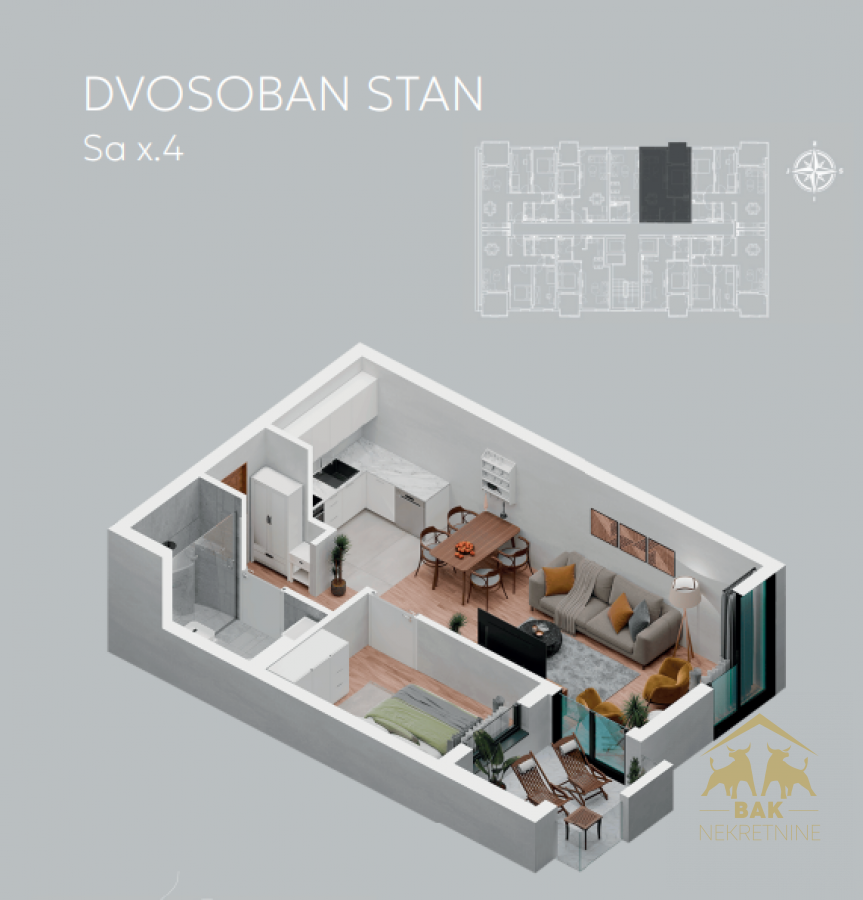 Predstavljamo Vam dvosoban stan u srcu Podbare, jedne od najautentičnijih i najbrže rastućih gradskih četvrti, gradi se moderan stambeni kompleks koji spaja udobnost, funkcionalnost i savremeni način života. U ponudi je stan u izgradnji, smešten u mirnom, ali odlično povezanom okruženju – idealan za porodičan život, ali i za one koji vole gradski puls. Kompleks je pažljivo osmišljen da zadovolji sve potrebe savremenog stanovanja. Obezbeđeno je obilje parking mesta, a tu su i uređeno dečije igralište, vrtić, kao i marketi, apotekе, restorani, kafići i fitnes centar – sve na nekoliko koraka od vašeg doma. Dodatna prednost je izuzetna lokacija – na samo par minuta hoda od Beogradskog keja, jednog od najlepših šetališta u Novom Sadu, idealnog za jutarnje trčanje, večernje šetnje ili opuštanje uz reku. Stanovi se grade prema najvišim standardima, uz upotrebu kvalitetnih materijala, sa akcentom na udobnost, svetlost i funkcionalnu organizaciju prostora. Ovo nije samo mesto za stanovanje – ovo je prostor u kojem možete živeti punim plućima.