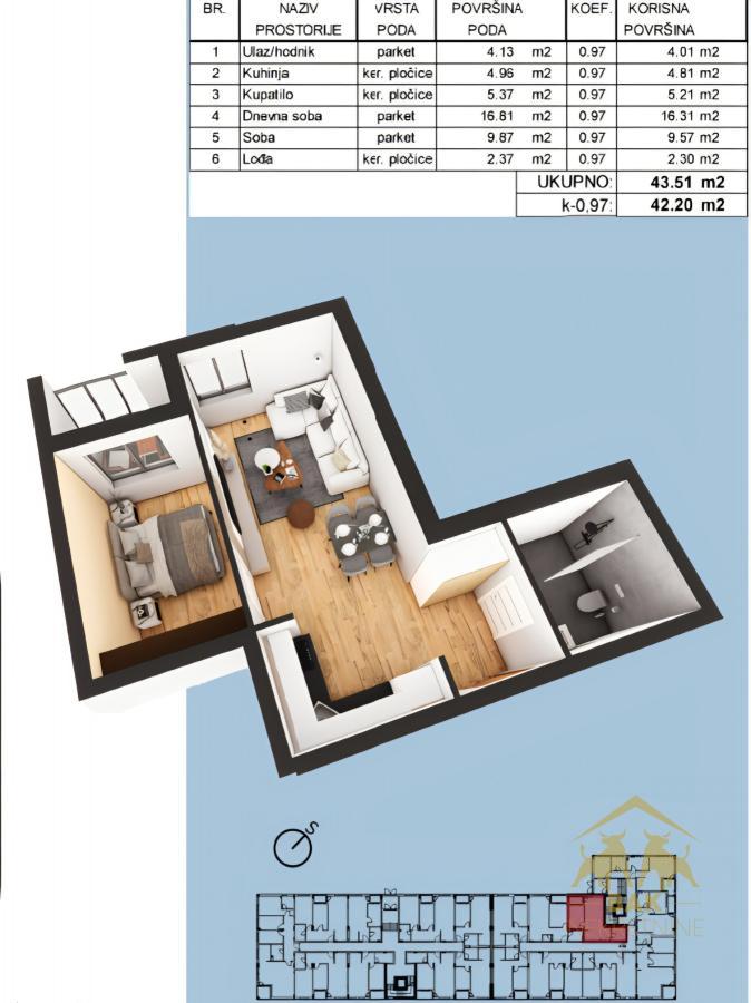U ponudi je moderan dvosoban stan u izgradnji, smešten u mirnom i sve traženijem delu Petrovaradina, u neposrednoj blizini glavnih saobraćajnica, ali dovoljno uvučen da pruža privatnost i ugodan porodični život. Lokacija je idealna kako za stanovanje, tako i kao investicija, zahvaljujući dobroj povezanosti sa gradom i blizini svih neophodnih sadržaja. Stan je površine 44m² i funkcionalno je organizovan tako da pruža maksimalnu iskorišćenost prostora. Sastoji se od prostranog dnevnog boravka sa kuhinjom i trpezarijskim delom, odvojene spavaće sobe, kupatila, hodnika i terase. Raspored prostorija omogućava udoban i praktičan svakodnevni život. Grejanje je na gas, sa ugrađenim kalorimetrima i radijatorskim sistemom, što omogućava kontrolu potrošnje i niže troškove tokom grejne sezone. Zgrada u kojoj se stan nalazi gradi renomirani investitor sa dugogodišnjim iskustvom i velikim brojem uspešno realizovanih projekata. Primenjeni su najkvalitetniji materijali i savremene tehnike gradnje, što garantuje visok nivo sigurnosti, dugotrajnosti i energetske efikasnosti. Posebna pažnja posvećena je funkcionalnosti, detaljima i kvalitetu završne obrade. Spoljna stolarija je od vrhunskog PVC sistema Rehau, u antracit boji spolja i beloj iznutra, što obezbeđuje odličnu termo i zvučnu izolaciju. Podne i zidne obloge čini kvalitetna italijanska granitna keramika brenda Tilezza, dok je sanitarna oprema proizvođača Ideal Standard, što dodatno doprinosi estetici i dugotrajnosti. Planirani rok završetka gradnje je kraj 2026. godine. Napomena: Kupac nema trošak agencijske provizije. Naša preporuka.