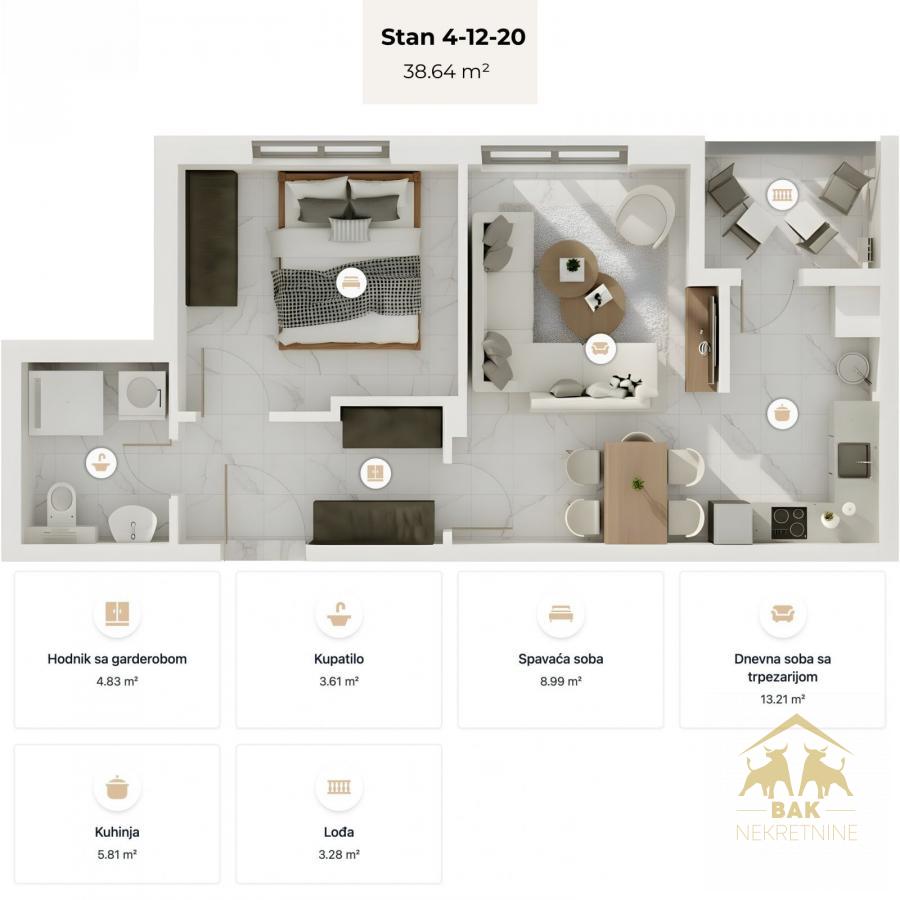 U okviru moderne stambene zgrade u samom centru Inđije, nalazi se funkcionalan stan od 38 m², koji je dostupan isključivo kroz našu ponudu, osmišljen tako da pruži maksimalnu iskorišćenost prostora i komfor u svakodnevnom životu. Zahvaljujući pažljivo planiranom rasporedu, stan je pogodan kako za stanovanje, tako i kao investicija za izdavanje. Stan se sastoji od dnevne sobe sa trpezarijom, kuhinje, dve spavaće sobe, kupatila i hodnika, dok terasa predstavlja dodatnu vrednost i prostor za odmor. Jasna organizacija prostorija omogućava dobru funkcionalnost i privatnost, uprkos kompaktnoj kvadraturi. Grejanje je podno, na gas, što obezbeđuje prijatan ambijent tokom cele godine uz racionalne mesečne troškove. Zgrada je savremene gradnje, sa kvalitetnim materijalima i modernim rešenjima. U sklopu zgrade nalaze se market, kafić i igraonica za decu, dok su svi važni gradski sadržaji dostupni pešice. U neposrednoj okolini su prodavnice, banke, pošta, pijaca, dom zdravlja, gradski park, vrtić, škola, kao i autobuska i železnička stanica. Stanarima su na raspolaganju parking mesta na otvorenom, uključujući i mesta prilagođena osobama sa invaliditetom, kao i mogućnost kupovine garažnog mesta, što predstavlja značajnu prednost za nekretninu u centralnoj gradskoj zoni. Ova nekretnina je odličan izbor za one koji traže praktičan i kvalitetan stan na izuzetnoj lokaciji, ali i kao sigurna i dugoročno isplativa investicija.