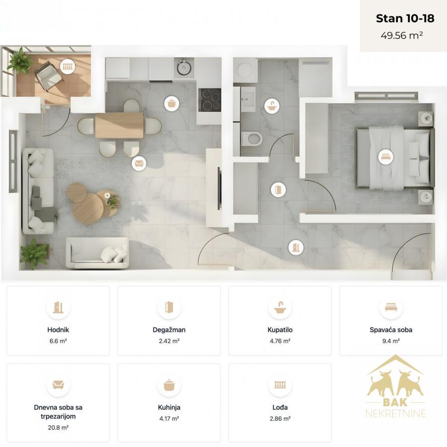 U okviru moderne stambene zgrade u samom centru Inđije, nalazi se funkcionalan stan od 50 m², koji je dostupan isključivo kroz našu ponudu, osmišljen tako da pruži maksimalnu iskorišćenost prostora i komfor u svakodnevnom životu. Zahvaljujući pažljivo planiranom rasporedu, stan je pogodan kako za stanovanje, tako i kao investicija za izdavanje. Stan se sastoji od dnevne sobe sa trpezarijom, kuhinje, dve spavaće sobe, kupatila, hodnika i degažmana, dok terasa predstavlja dodatnu vrednost i prostor za odmor. Jasna organizacija prostorija omogućava dobru funkcionalnost i privatnost, uprkos kompaktnoj kvadraturi. Grejanje je podno, na gas, što obezbeđuje prijatan ambijent tokom cele godine uz racionalne mesečne troškove. Zgrada je savremene gradnje, sa kvalitetnim materijalima i modernim rešenjima. U sklopu zgrade nalaze se market, kafić i igraonica za decu, dok su svi važni gradski sadržaji dostupni pešice. U neposrednoj okolini su prodavnice, banke, pošta, pijaca, dom zdravlja, gradski park, vrtić, škola, kao i autobuska i železnička stanica. Stanarima su na raspolaganju parking mesta na otvorenom, uključujući i mesta prilagođena osobama sa invaliditetom, kao i mogućnost kupovine garažnog mesta, što predstavlja značajnu prednost za nekretninu u centralnoj gradskoj zoni. Ova nekretnina je odličan izbor za one koji traže praktičan i kvalitetan stan na izuzetnoj lokaciji, ali i kao sigurna i dugoročno isplativa investicija.