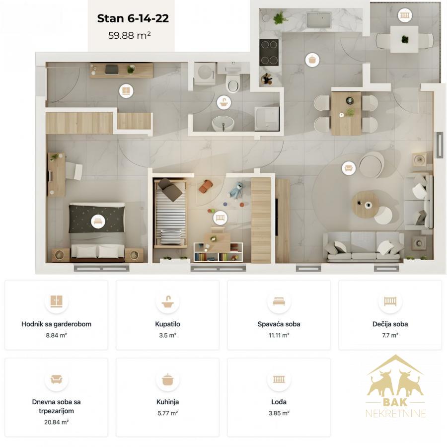 U samom centru Inđije nalazi se komforan trosoban stan površine 60 m², koji je dostupan isključivo kroz našu ponudu, smešten u savremenoj stambeno-poslovnoj zgradi koja objedinjuje urbani način života i mirno okruženje. Ova nekretnina je idealna za porodično stanovanje, ali i kao dugoročno sigurna investicija. Stan je funkcionalno organizovan i jasno podeljen na dnevnu i noćnu zonu. Dnevni deo čine prostrana dnevna soba povezana sa trpezarijom i kuhinjom, prostor osmišljen za svakodnevni boravak i porodična okupljanja. Noćna zona obuhvata dve odvojene spavaće sobe koje pružaju privatnost i komfor, dok se u stanu nalaze i kupatilo, kao i hodnik sa dovoljno prostora za plakare i odlaganje. Podno grejanje na gas obezbeđuje prijatnu temperaturu tokom cele godine uz racionalne troškove, a kvalitet gradnje i savremeni materijali dodatno doprinose udobnosti stanovanja. U okviru same zgrade nalaze se market, kafić i igraonica za decu, dok su svi ključni gradski sadržaji na dohvat ruke. U neposrednoj okolini su gradski park, dom zdravlja, vrtić, škola, pijaca, banke, kao i autobuska i železnička stanica, što ovu lokaciju čini izuzetno praktičnom za svakodnevni život. Stanari imaju na raspolaganju parking mesta na otvorenom, uključujući i mesta prilagođena osobama sa invaliditetom, uz mogućnost kupovine garažnog mesta, što je velika prednost za nekretninu u samom centru grada. Ovaj stan predstavlja odličan izbor za porodice koje žele komfor i centralnu lokaciju, ali i za kupce koji traže stabilnu i dugoročno isplativu investiciju.