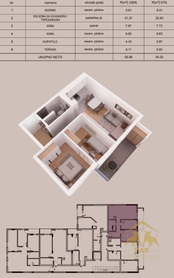 U ponudi je kvalitetan dvoiposoban stan u izgradnji, smešten u delu grada poznatom po dobroj infrastrukturi i brzoj povezanosti sa centrom, u blizini glavnih saobraćajnica i svih sadržaja neophodnih za svakodnevni život. Ova lokacija je posebno interesantna kako za porodično stanovanje, tako i za investiciju, zahvaljujući konstantnom razvoju i rastu potražnje. Stan površine 56m² projektovan je sa akcentom na funkcionalnost i udobnost. Raspored prostorija je veoma praktičan i obuhvata dnevni boravak sa trpezarijom i kuhinjom kao centralni deo stana, dve spavaće sobe, kupatilo, hodnik i terasu koja pruža dodatni prostor za uživanje. Grejanje je na gas, sa ugrađenim kalorimetrima i radijatorskim sistemom, što omogućava ekonomično korišćenje i potpunu kontrolu troškova. Zgradu gradi proveren investitor sa bogatim iskustvom i brojnim realizovanim projektima, uz primenu savremenih standarda gradnje i pažljivo biranih materijala. Posebna pažnja usmerena je na dugotrajnost, sigurnost i energetsku efikasnost, kao i na kvalitet svakog segmenta završnih radova. U stanu će biti ugrađena vrhunska oprema. Spoljna stolarija od PVC sistema Rehau u antracit boji spolja i beloj iznutra obezbeđuje odličnu izolaciju. Podovi i zidovi biće obloženi italijanskom granitnom keramikom brenda Tilezza, dok je kupatilo opremljeno sanitarijama proizvođača Ideal Standard, što garantuje dug vek trajanja i moderan izgled enterijera. Napomena: Kupac nema trošak agencijske provizije. Naša preporuka.