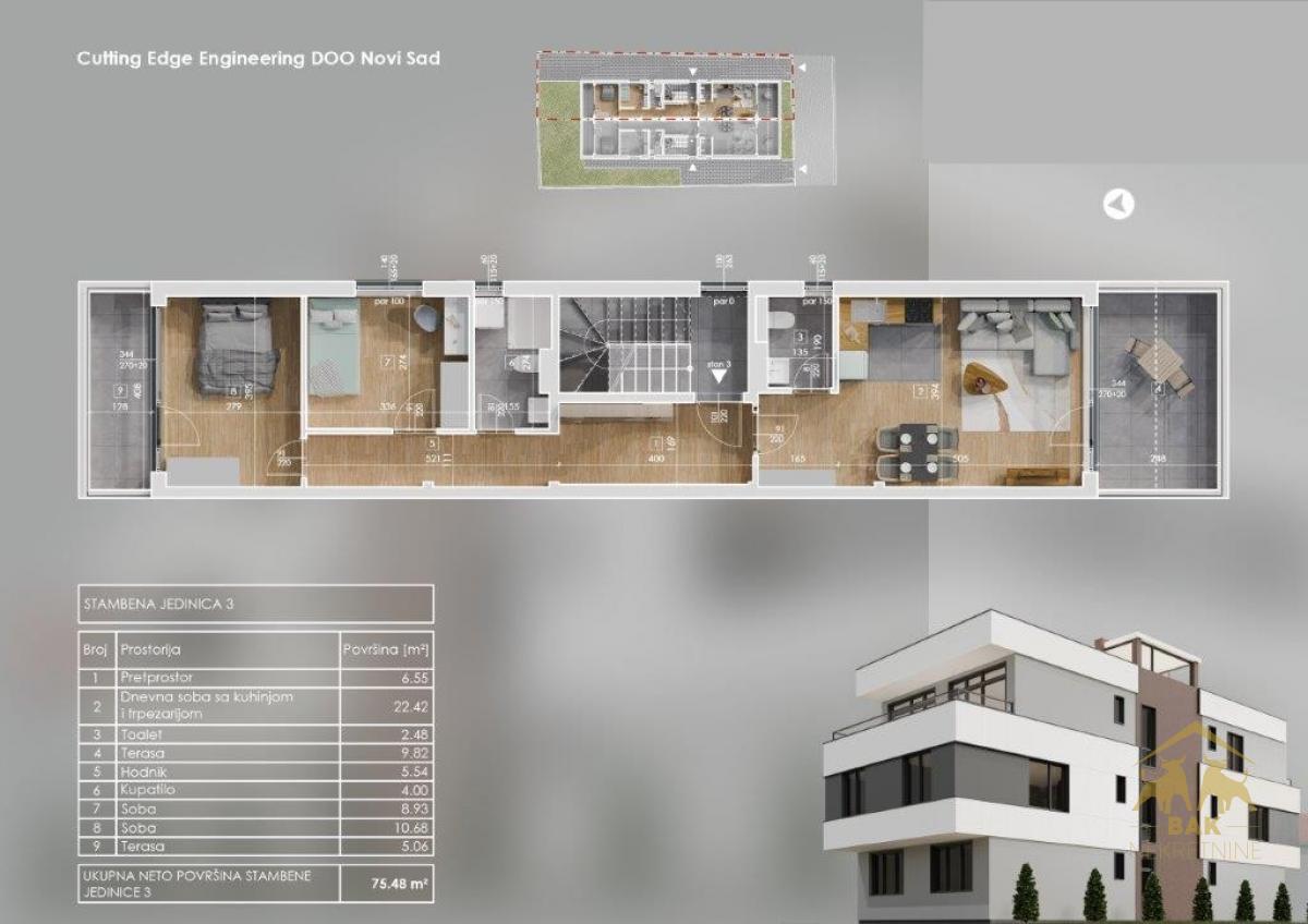 U ponudi je stan u izgradnji u mirnoj ulici na Telepu, u blizini Bulevara patrijarha Pavla. Zgrada je planirana sa malim brojem stanova, što obezbeđuje prijatniji i mirniji ambijent za stanovanje.Stan je površine 79 m², strukture trosoban, i nalazi se na drugom spratu od ukupno dva. Završetak radova planiran je za početak 2027. godine. Cene su sa PDV-om, a kupovina je moguća i putem kredita. Grejanje je gasno, kombinovano, a svaki stan ima svoj gasni kotao. Za stanare je obezbeđeno slobodno parking mesto. Ovaj stan predstavlja dobru priliku za kupovinu nekretnine u kvalitetnoj i mirnoj lokaciji u Novom Sadu.